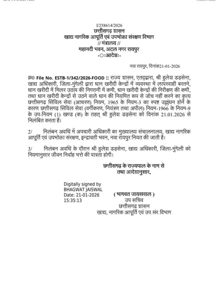 मंत्रालय खाद्य एवं नागरिक आपूर्ति एवं उपभोक्ता संरक्षण विभाग से जारी आदेश के अनुसार खाद्य अधिकारी हुलेश डडसेना के द्वारा जिले में धान खरीदी केंद्र में व्यवस्था मे लापरवाही बरतने धान खरीदी में मिलर उठाओ की निगरानी में कमी, धान खरीदी केंद्रों के निरीक्षण की कमी तथा धान खरीदी केंद्रों से उठने वाले धान की नियमित रूप से जांच नहीं करने का करने का मृत छत्तीसगढ़ सिविल सेवा आचरण के नियम 1965 के नियम 3 का स्पष्ट उल्लंघन होने के करण छत्तीसगढ़ सिविल सेवा नियम 1966 नियम 9 के उप नियम (1) खंड (क) के तहत हुलेश डडसेना को तत्काल प्रभाव से निलंबित किया जाता है। देखिए राज्य शासन का आदेश