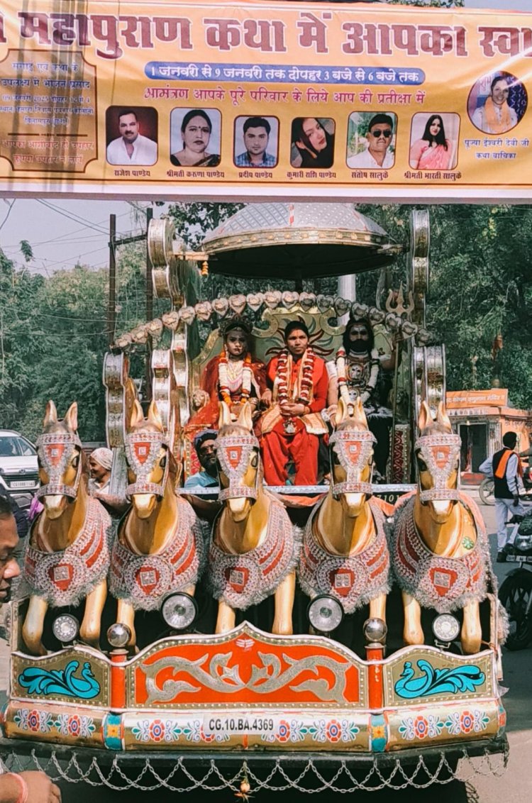 शोभा यात्रा में रथ पर कथावाचिका ईश्वरी देवी भी सवार थी। कलश यात्रा आयोजन स्थल से विधिवत निकालकर जरहाभाठा, सिंधी कॉलोनी, कारगिल चौक, कस्तूरबा नगर के प्रमुख मार्गों से होकर पुनः पत्रकार कॉलोनी पहुंचकर संपन्न हुई। रास्ते भर श्रद्धालुओं ने पुष्पवर्षा कर कलश यात्रा का स्वागत किया। आयोजक राजेश पांडेय ने बताया कि शिव महापुराण 1 जनवरी से प्रारंभ होकर 9 जनवरी को पूर्णाहुति के साथ संपन्न होगी। कथा में प्रतिदिन भक्तों के लिए आध्यात्मिक प्रवचन एवं भजन संध्या का आयोजन रहेगा।