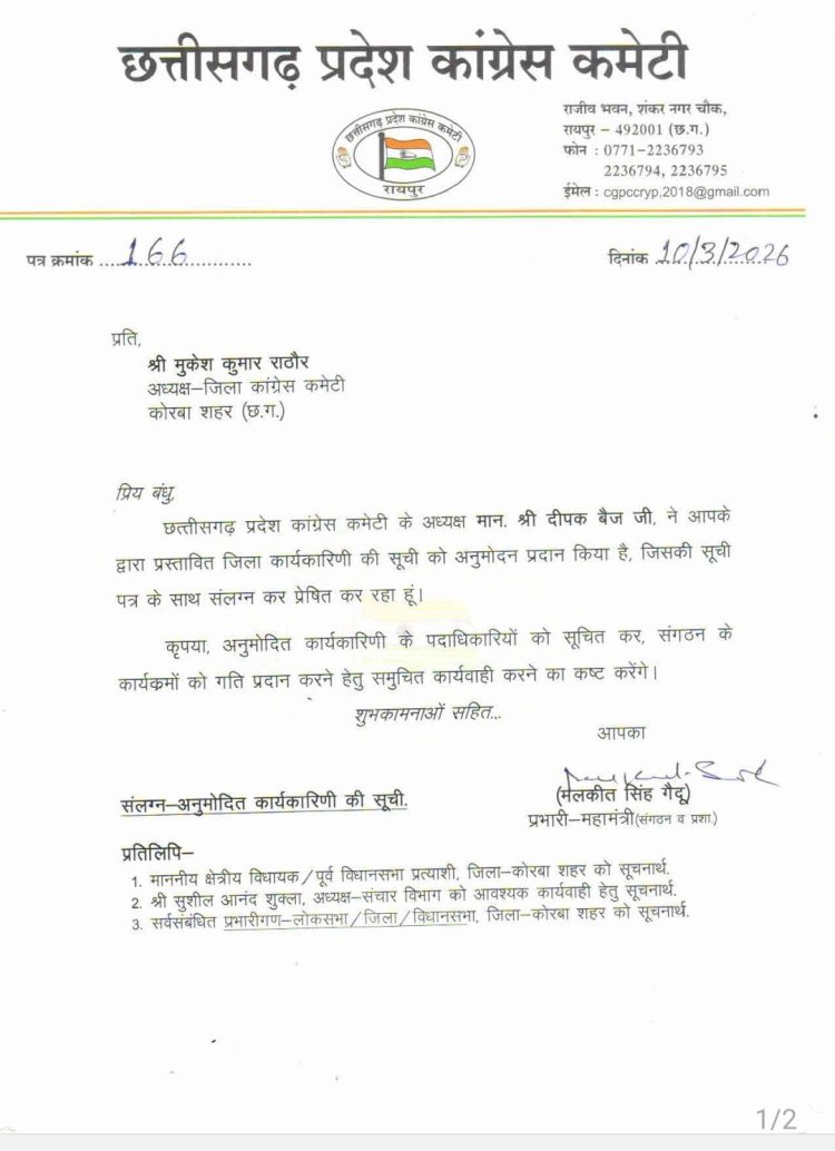 कोरबा। प्रदेश कांग्रेस कमेटी के अनुमोदन पर कोरबा कांग्रेस कमेटी शहर के जिला कार्यकारणी की घोषणा की गई है। जारी लिस्ट के अनुसार जिला कांग्रेस कमेटी के अध्यक्ष मुकेश कुमार राठौर ने अपनी नई कार्यकारिणी में 6 उपाध्यक्ष,10 जिला महामंत्री ,12 जिला सचिव सहित कार्यकारणी की लिस्ट जारी की है।