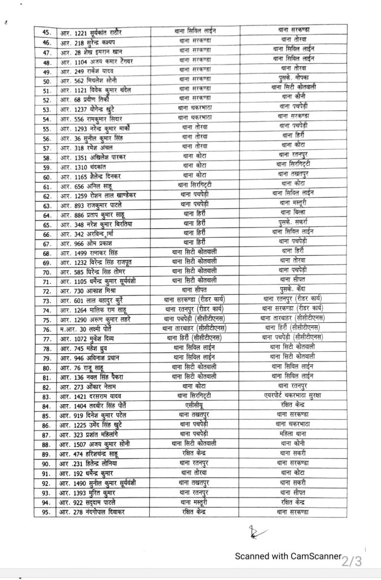 बिलासपुर। बिलासपुर एसएसपी रजनेश सिंह ने प्रशासनिक कसावट हेतु लंबे समय से एक ही जगह में जमे पुलिसकर्मियों का तबादला आदेश जारी किया है। जारी आदेश के तहत तीन उप निरीक्षक,10 सहायक उप निरीक्षक, 23 प्रधान आरक्षक और 94 आरक्षकों का तबादला किया गया हैं। देखें आदेश...