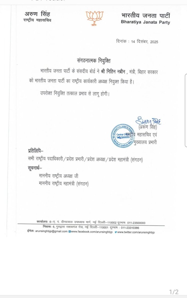 *Breaking News: नितिन नबीन को बड़ी जिम्मेदारी बनाए गए राष्ट्रीय कार्यकारी अध्यक्ष*
