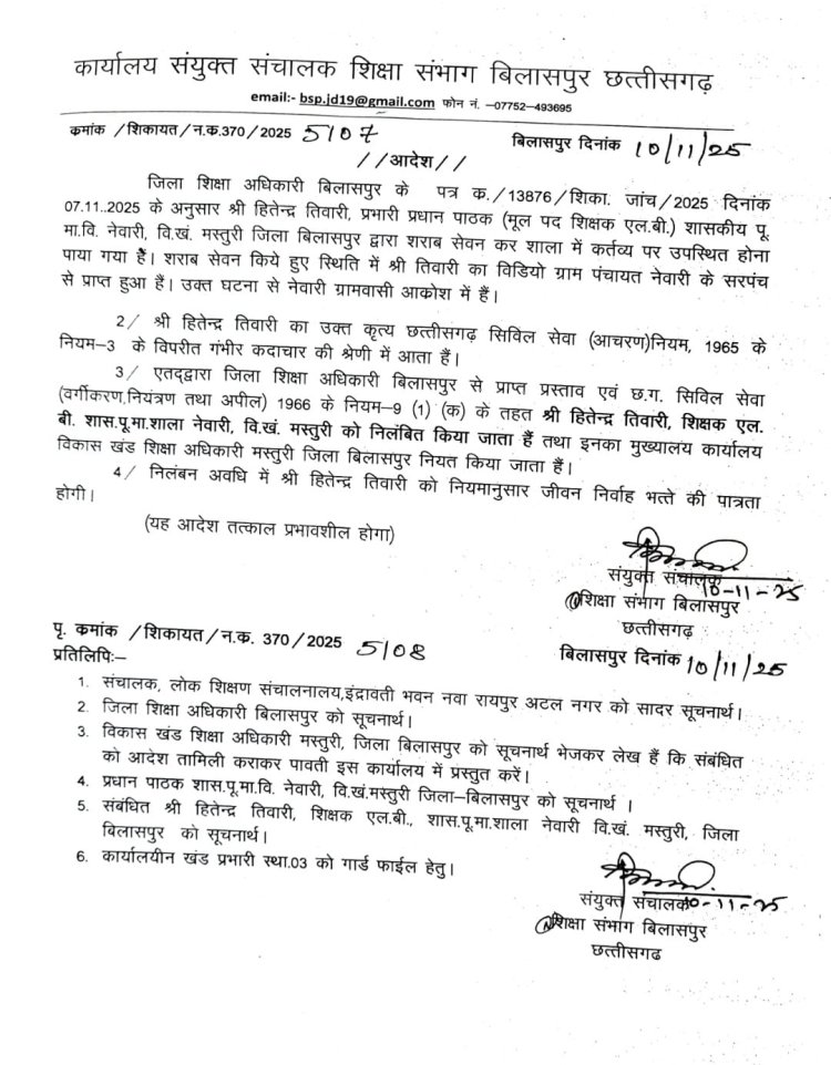 संयुक्त संचालक शिक्षा संभाग बिलासपुर में जारी आदेश में लिखा है कि जिला शिक्षा अधिकारी बिलासपुर के पत्र 7 नवंबर 2025 के अनुसार हितेंद्र तिवारी प्रभारी प्रधान पाठक (मूल पद शिक्षक एलबी) शासकीय पूर्व माध्यमिक विद्यालय नेवारी विकासखंड मस्तूरी जिला बिलासपुर द्वारा शराब सेवन कर शाला में कर्तव्य पर उपस्थित होना पाया गया, शराब सेवन की स्थिति में तिवारी का वीडियो ग्राम पंचायत नेवारी के सरपंच से प्राप्त हुआ है। उक्त घटना से नेवारी ग्राम में भारी आक्रोश है, शिक्षक हितेंद्र तिवारी का उक्त कृत छत्तीसगढ़ सिविल सेवा आचरण नियम, 1965 के नियम 3 के विपरीत गंभीर श्रेणी में आता है।  जिला शिक्षा अधिकारी बिलासपुर से प्राप्त प्रस्ताव एवं छत्तीसगढ़ सिविल सेवा (वर्गीकरण नियंत्रण तथा अपील) 1966 के नियम 9(1) (क) के तहत हितेंद्र तिवारी शिक्षक एलबी शासकीय पूर्व माध्यमिक शाला नेवारी विकासखंड मस्तूरी को निलंबित किया जाता है।  निलंबन अवधि में उनका मुख्यालय कार्यालय विकासखंड शिक्षा अधिकारी मस्तूरी होगा। देखिए आदेश