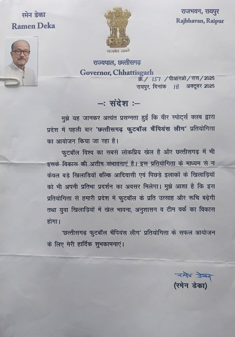 छत्तीसगढ़ फुटबॉल चैंपियंस लीग के चौथे राउंड में लायंस, जेएसएफ और पैंथर्स की जीत, महामहिम राज्यपाल श्री रमन डेका ने लीग की सफलता के लिए शुभकामनाएं प्रेषित की