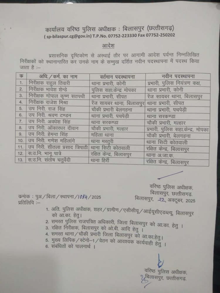 निरीक्षक भावेश सेंदे को पुलिस सहायता केंद्र मोपका से थाना प्रभारी कोनी बनाया गया है, इसी प्रकार विवादों में घिरे निरीक्षक गोपाल कृष्ण सतपथी को सीपत थाना से हटाकर साइबर सेल बिलासपुर भेजा गया है। निरीक्षक राजेश मिश्रा को साइबर सेल बिलासपुर से सीपत का नया थाना प्रभारी बनाया गया है।