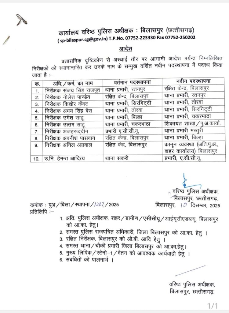 *टीआई ट्रांसफर न्यूज; रतनपुर, बिल्हा चकरभाठा,सहित कई थाने के बदले गए थानेदार एसएसपी ने जारी किए आदेश*