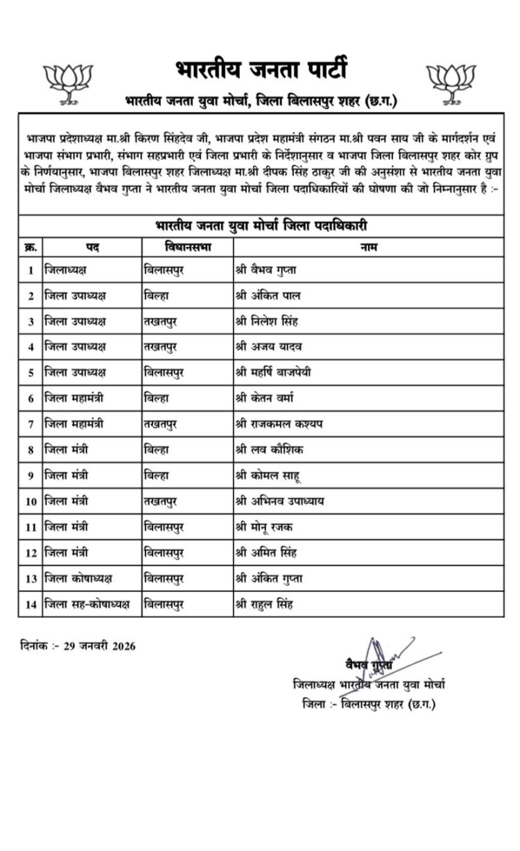 बिलासपुर। भारतीय जनता पार्टी के प्रदेश अध्यक्ष किरण सिंह देव एवं संगठन महामंत्री पवन साय की सहमति से भारतीय जनता पार्टी के शहर जिला अध्यक्ष दीपक सिंह ठाकुर की अनुशंसा पर युवा मोर्चा के जिला अध्यक्ष वैभव गुप्ता ने भारतीय जनता युवा मोर्चा के जिला पदाधिकारी की घोषणा की है। जारी लिस्ट के अनुसार जिला पदाधिकारियों में 4 उपाध्यक्ष,दो महामंत्री सहित 6 मंत्री बनाए गए हैं । जिला उपाध्यक्ष पद पर अंकित पाल, निलेश सिंह, महर्षि बाजपेयी, अजय यादव को जिम्मेदारी दी गई है तो केतन वर्मा और राजकमल कश्यप को महामंत्री बनाया गया है। देखिए सूची
