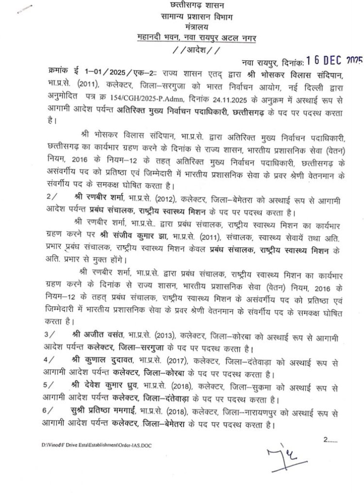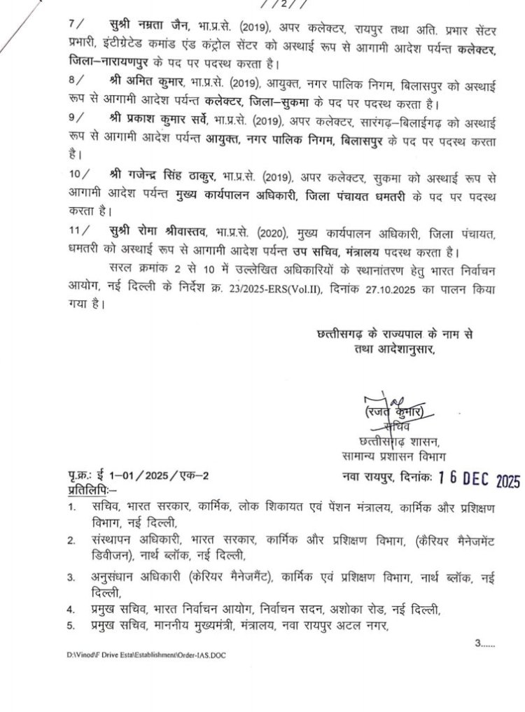 रायपुर। कई IAS अफसरों के ट्रांसफर आदेश जारी किए गए हैं सामान्य प्रशासन विभाग द्वारा जारी आदेश के अनुसार, राज्य के विभिन्न जिलों और विभागों में पदस्थ 11 आईएएस अधिकारियों को नई जिम्मेदारियां सौंपी गई हैं। तबादला सूची में कलेक्टर, सचिव स्तर और विभागीय पदों पर कार्यरत अधिकारी शामिल हैं। देखिए लिस्ट